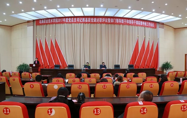 12月27日,烏海職業技術學院2017年度黨總支書記抓基層黨建述職評議和部門領導班子、領導干部實績考核大會在辦公樓報告廳舉行。學院黨委書記劉洪運,黨委委員、副院長張佳文、李峰、趙秀平出席會議,全體教職員工參加會議。黨委副書記、院長牟占軍主持會議并對述職發言作了要求。